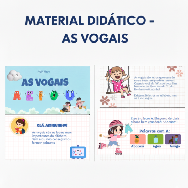 ➡️Apresenta as vogais A, E, I, O, U, de forma clara e atrativa.